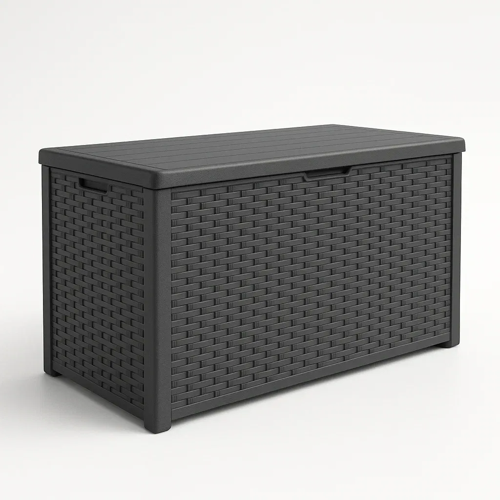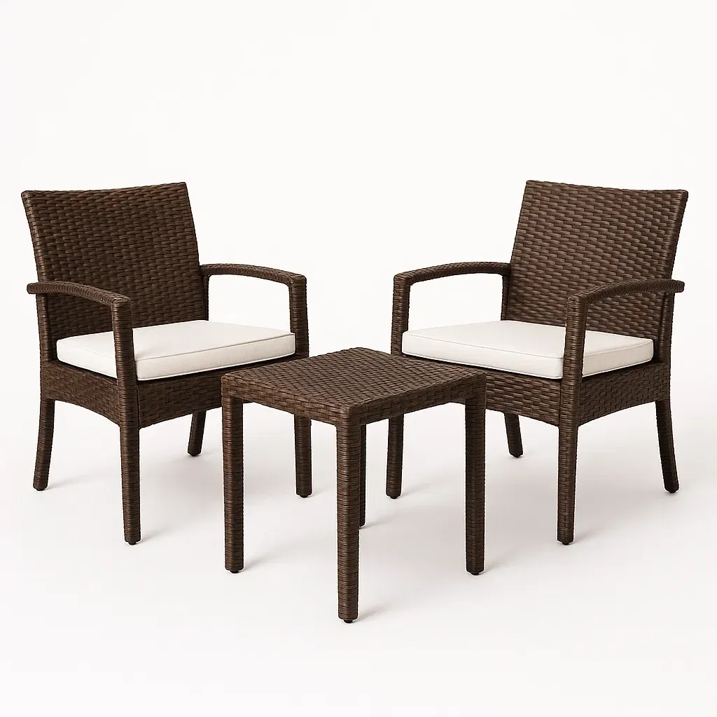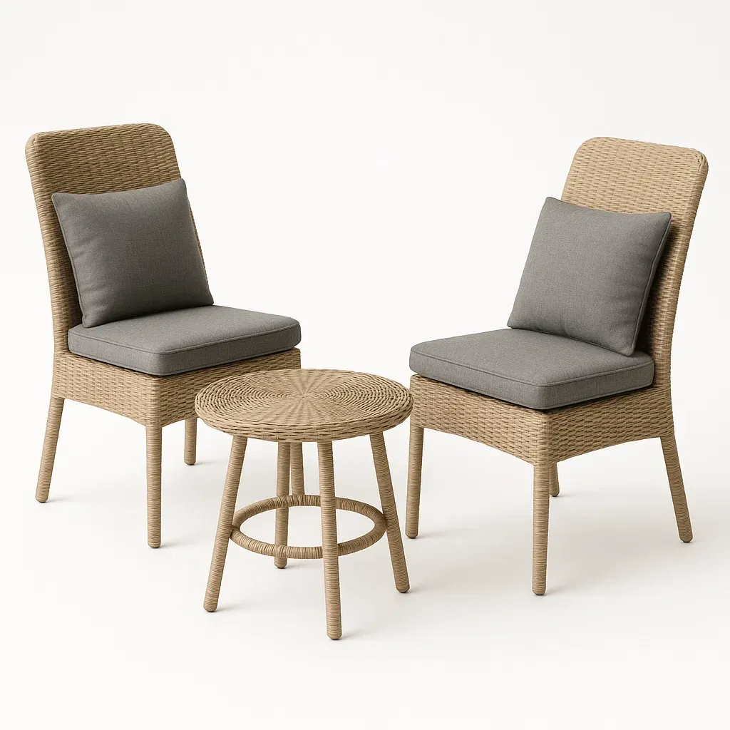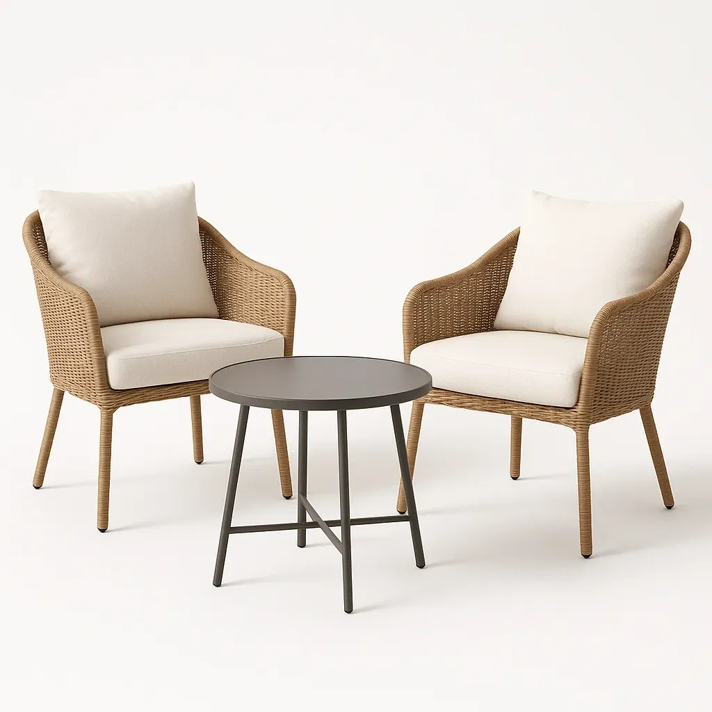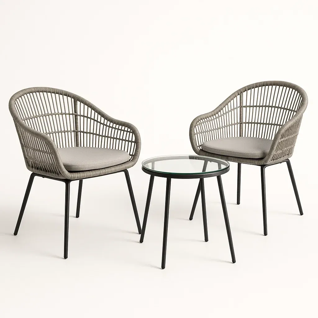 El conjunto de muebles incluye una mesa y cuatro sillas, fabricados en ratán sintético con estructura de acero.